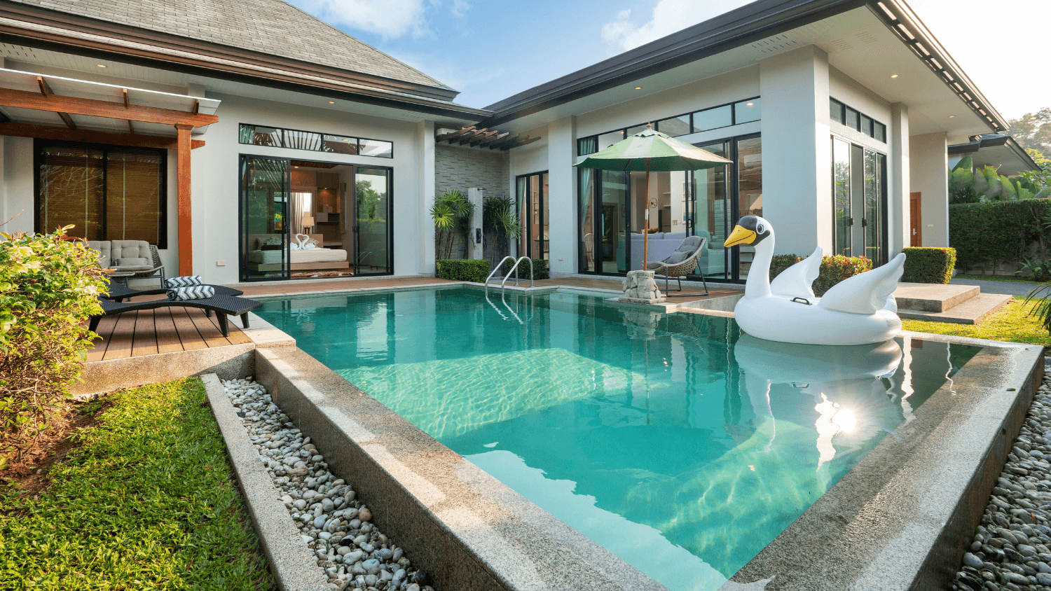 - Un espace piscine intégré, souvent entouré de terrasses en bois ou en pierre naturelle, créant une atmosphère harmonieuse.